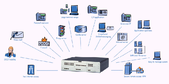 - 一體化:將多項(xiàng)功能集成到一個(gè)單一設(shè)備中,這些包括:因特網(wǎng)接入、E-mail服務(wù)器、局域網(wǎng)、計(jì)算機(jī)電話集成(CTI)、呼叫管理(嵌入式個(gè)人助理及語音信箱,內(nèi)部移動通信等)。