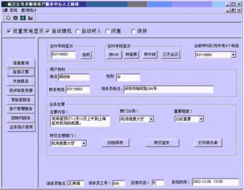 。。客戶打入電話后,當(dāng)系統(tǒng)的自動(dòng)語(yǔ)音應(yīng)答子系統(tǒng)無(wú)法解決客戶問(wèn)題時(shí),客戶可選擇人工服務(wù),由航空公司客戶服務(wù)代表直接接聽(tīng)客戶電話,處理并解決客戶問(wèn)題。此時(shí)客戶同座席話務(wù)人員直接溝通,并同時(shí)記錄下該客戶的聯(lián)系方式,將相關(guān)數(shù)據(jù)添加入系統(tǒng)數(shù)據(jù)庫(kù);也可以在數(shù)據(jù)庫(kù)的支持下回答機(jī)場(chǎng)航班/航空貨運(yùn)信息及相關(guān)規(guī)定等的咨詢和疑問(wèn)、訂座/訂艙。客戶也可以選擇自動(dòng)語(yǔ)音服務(wù)方式,根據(jù)系統(tǒng)的語(yǔ)音提示輸入按鍵,選擇類(lèi)別,將自己的投訴和建議以及自己的聯(lián)系方式信息以留言錄音的方式保存在系統(tǒng)中。系統(tǒng)同時(shí)還支持自動(dòng)傳真方式,客戶可以通過(guò)傳真機(jī)進(jìn)入本系統(tǒng),通過(guò)按鍵選擇傳真方式,將自己的意見(jiàn)建議等的文本內(nèi)容傳真給系統(tǒng),系統(tǒng)自動(dòng)接受并存入數(shù)據(jù)庫(kù)。