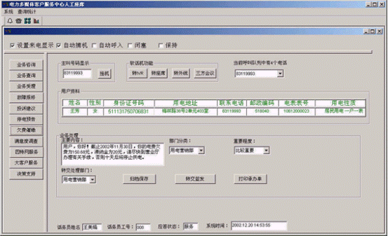 (2)電力業(yè)務查詢-通過自動語音應答/傳真回復、人工座席、因特網、電子郵件、手機短信息等方式為用戶提供電力業(yè)務查詢服務。主要包括:電量、電費及欠費查詢;電費明細單查詢;電價查詢;所申辦的業(yè)務辦理進度查詢;故障申告和用戶投訴處理結果查詢。