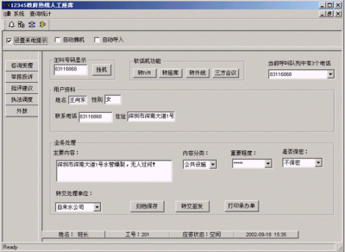 系統(tǒng)提供強大的信息資料處理功能,座席可記錄舉報、投訴、批評、建議等記錄單,將信息資料歸檔保存、打印受理單或?qū)⑹芾韱蔚任募D(zhuǎn)交簽發(fā)相關(guān)政府職能部門;系統(tǒng)引入CRM(Customer Relationship Management客戶關(guān)系管理)功能,可對收集到的信息進行分類統(tǒng)計匯總、按具體需求制定報表,提供個性化客戶管理與服務(wù);為政府提供決策支持和工作改進。