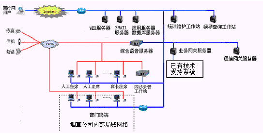 卷煙經(jīng)銷戶等客戶利用電話、傳真、電子郵件、因特網(wǎng)、手機、短消息等撥打統(tǒng)一的特服號碼(如800XXX或9XXXX)進入煙草公司呼叫中心,本系統(tǒng)依托煙草公司各類業(yè)務技術支持系統(tǒng)和網(wǎng)絡系統(tǒng),實現(xiàn)煙草專賣局原有管理系統(tǒng)/業(yè)務系統(tǒng)及數(shù)據(jù)庫的無縫連接,通過人工受理或自動語音服務等方式全天24小時不間斷地為客戶提供各種服務。