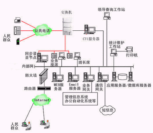 本系統(tǒng)物理結(jié)構(gòu)由排隊(duì)交換機(jī)、CTI服務(wù)器、IVR(交互式語(yǔ)音應(yīng)答)/IFR(交互式傳真應(yīng)答)服務(wù)器、業(yè)務(wù)代表座席(邏輯上分為:普通業(yè)務(wù)代表座席、專家座席、WEB座席等)、班長(zhǎng)座席、統(tǒng)計(jì)維護(hù)管理工作站、因特網(wǎng)(WEB)服務(wù)器、電子郵件(EMAIL)服務(wù)器、數(shù)據(jù)庫(kù)/應(yīng)用服務(wù)器、錄音留言工作站、領(lǐng)導(dǎo)查詢工作站、業(yè)務(wù)網(wǎng)關(guān)服務(wù)器、通信網(wǎng)關(guān)、網(wǎng)絡(luò)系統(tǒng)等和應(yīng)用軟件構(gòu)成。