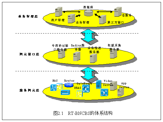 RT-BNCBS管理計(jì)費(fèi)平臺從邏輯上分為三層:服務(wù)網(wǎng)元層、網(wǎng)元接口層和業(yè)務(wù)管理層。如圖1所示。