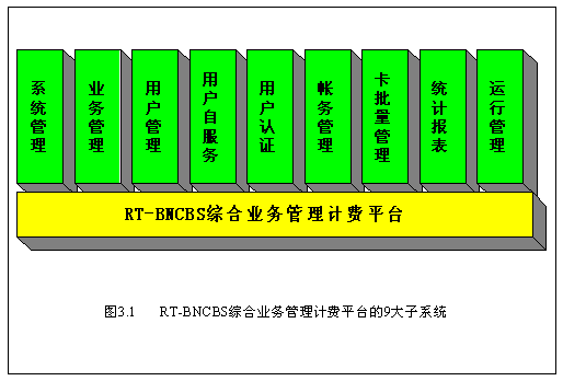 從系統(tǒng)接口角度,我們把RT-BNCBS綜合業(yè)務(wù)管理計(jì)費(fèi)平臺分成9大子系統(tǒng),如圖4.1所示: