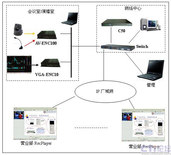 在分析了海通證券的實(shí)際需求和網(wǎng)絡(luò)環(huán)境以后,決定采用一套DSS-R-C50+來組建整個(gè)媒體廣播系統(tǒng)。系統(tǒng)由媒體采集系統(tǒng)AV-ENC100/VGA-ENC100,流媒體處理和錄制系統(tǒng)C50和媒體接收系統(tǒng)RecPlayer組成。通過此系統(tǒng)可以實(shí)現(xiàn)語音、視頻和計(jì)算機(jī)桌面的同步實(shí)時(shí)直播、錄制和點(diǎn)播。系統(tǒng)的結(jié)構(gòu)圖如下: