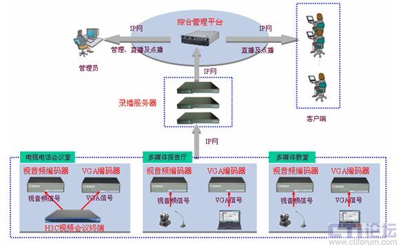 對于學校經(jīng)常進行學術(shù)報告的錄播,可以將多媒體報告廳的視頻和音頻輸入到視音頻編碼器上,將電腦的VGA輸入到VGA編碼器上,視音頻編碼器和VGA編碼器可以將接入的信號進行編碼,通過網(wǎng)絡(luò)傳給錄播服務器進行信號處理、整合,最終傳輸?shù)骄C合管理平臺上。