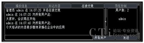 系統(tǒng)增加了多方文字互動交流功能,在線交流功能可以選擇給所有人員發(fā)送消息,也可以選擇給某一特定人員發(fā)送。這樣在會議或培訓的過程中,管理員可以選擇性的提出相應(yīng)的問題給相關(guān)人員,考核相關(guān)人員的培訓效果;其他人員也可以將會議或培訓過程中遇到的疑問、難點及時的反應(yīng)給管理員進行解答,增強會議或培訓的成效。