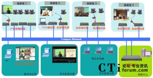 在南洋理工的商學(xué)院中有一個(gè)培訓(xùn)中心,培訓(xùn)中心中有4個(gè)培訓(xùn)課室。 商學(xué)院的老師們希望可以把這4培訓(xùn)課室中的培訓(xùn)課程錄制下來,并可以同時(shí)直播到其它教室。老師可以監(jiān)控這4個(gè)培訓(xùn)課室的培訓(xùn)情況。學(xué)生可以使用PC通過校園網(wǎng)收看到實(shí)時(shí)的培訓(xùn)情況,及培訓(xùn)后的回放他們可能錯(cuò)過了的培訓(xùn)。系統(tǒng)可與NTU現(xiàn)有的E_learning系統(tǒng)無縫融合,為為豐富E_learning的課件資源提供低成本、高效率的制作手段。同時(shí)系統(tǒng)應(yīng)該便于維護(hù)及用戶界面友好,而且便于以后的擴(kuò)容。因培訓(xùn)室的功能差異,每一間培訓(xùn)室內(nèi)所需記錄的信號(hào)類型及數(shù)量均不相同,要求系統(tǒng)能夠進(jìn)行匹配和適應(yīng)。