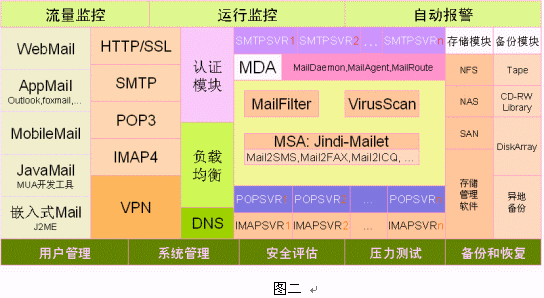 系統(tǒng)采用模塊化設(shè)計、具有良好的封裝性,使系統(tǒng)具有強大的擴展性。郵件核心系統(tǒng)和郵件前端(Webmail)系統(tǒng)可以運行在不同的主機上,可以將軟件的不同模塊,如收發(fā)模塊、用戶認證模塊、郵件存儲模塊、用戶接入模塊等,分別運行在不同的機器上,共同來完成整個電子郵件系統(tǒng)的功能。如果需要的話,每一種模塊還可以再拆分在不同的服務(wù)器上運行,實現(xiàn)負載分擔,因此系統(tǒng)可以根據(jù)需要和用戶的使用模式進行定制。