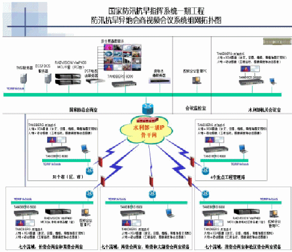 "工欲善其事,必先利其器"。為了推動(dòng)國家"金水工程"對信息化的要求,2003年,水利部就開始著手籌建國家防汛抗旱指揮視頻會(huì)議系統(tǒng)。按照當(dāng)初的項(xiàng)目規(guī)劃,這次視頻會(huì)議系統(tǒng)的建設(shè)主要包括水利部、7個(gè)流域機(jī)構(gòu)、31個(gè)。▍^(qū)、市)和4個(gè)重點(diǎn)工程局等43個(gè)單位的44個(gè)節(jié)點(diǎn)。