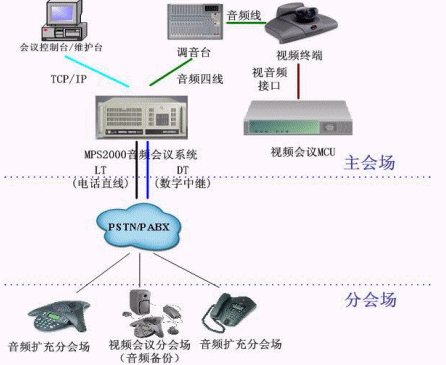 - MPS2000音頻會(huì)議系統(tǒng)通過(guò)音頻四線接口與主會(huì)場(chǎng)調(diào)音臺(tái)相連,保證視頻MCU中的音頻與音頻會(huì)議系統(tǒng)中的音頻互通。