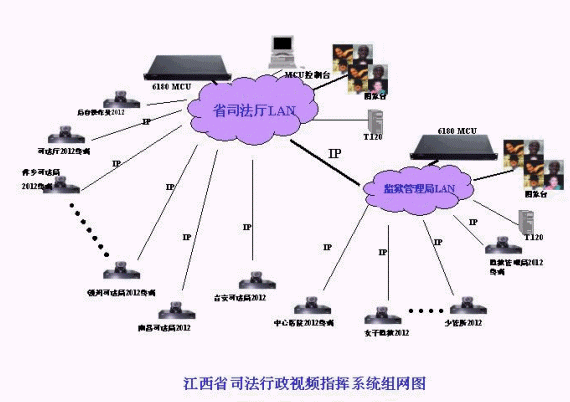 江西司法視頻會(huì)議系統(tǒng)的拓?fù)浣Y(jié)構(gòu)如圖所示。整個(gè)視頻會(huì)議系統(tǒng)為星型拓?fù)浣Y(jié)構(gòu),其中二級(jí)網(wǎng)以省司法廳和省監(jiān)獄管理局為主會(huì)場,放置2個(gè)MCU;另外,包括11個(gè)地市司法局的分會(huì)場(南昌、九江、贛州、吉安、撫州、鷹潭、萍鄉(xiāng)、新余、上饒、景德鎮(zhèn)、宜春),14個(gè)監(jiān)獄和農(nóng)場分會(huì)場,傳輸網(wǎng)絡(luò)為2M IP網(wǎng)絡(luò),視頻會(huì)議協(xié)議為H.323;司法局和監(jiān)獄管理局也可以單獨(dú)成網(wǎng),在分別依托省司法廳和省監(jiān)獄管理局MCU的情況下,各地市司法局或監(jiān)獄系統(tǒng)可與省司法廳或省監(jiān)獄管理局單獨(dú)進(jìn)行雙向的視頻會(huì)議,整個(gè)系統(tǒng)具有很強(qiáng)的靈活性和擴(kuò)展性。