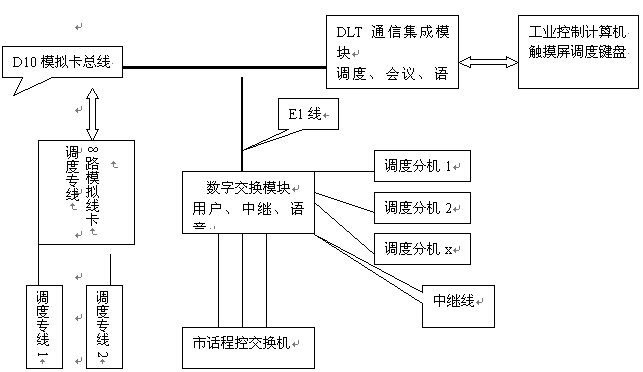 在DLT多路通通信系統(tǒng)平臺中,由于DLT通信集成模塊具有D10總線,可以和模擬環(huán)路用戶卡相連,實現直接用戶線功能,因而可克服上述兩種調度設備的不足,以滿足現代化生產的快速要求、廣域,智能化調度指揮要求。