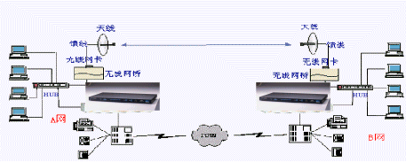 A網(wǎng)與B網(wǎng)分別為兩個局域網(wǎng),通過兩臺WavePoint II無線網(wǎng)橋將兩個局域網(wǎng)連在一起,網(wǎng)橋上的RJ45口或BNC細纜接口與局域網(wǎng)相連。每臺網(wǎng)橋上插有一塊WaveLAN無線PC卡,PC卡的射頻輸出端口,通過饋線接到天線,通過PC卡來完成無線鏈路的連通。無線網(wǎng)橋連接完成后的效果類似HUB級連。IP語音網(wǎng)關-HGW-904的局域網(wǎng)接口(RJ45)連接到局域網(wǎng)的HUB上,根據(jù)用戶實際的話務量,選用Line端口接入用戶電話交換機(PBX),PBX接普通電話機和傳真機,并連接至電話公網(wǎng)(PSTN)。其中所需設備:HGW-904