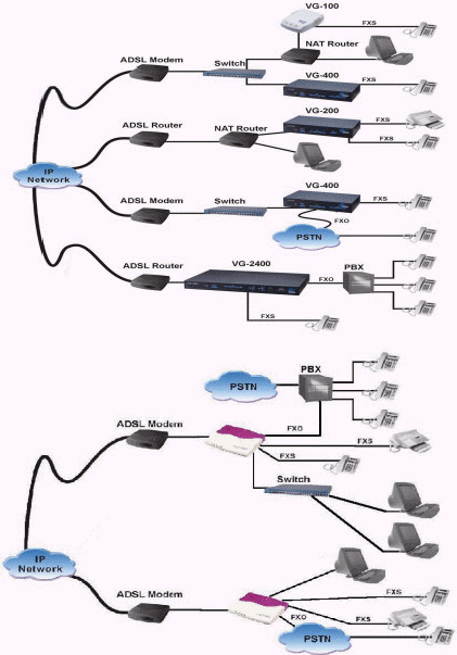 總部采用可堆疊的VG-2000,通過IP網(wǎng)絡(互聯(lián)網(wǎng))同各中心或分支機構的相連,利用PBX(小型電話交換總機)的交換能力將話音自動轉到VG-2000上,通過數(shù)據(jù)專線、VPN或Internet傳輸。可以在VG-2000上進行流量控制(Bandwidth