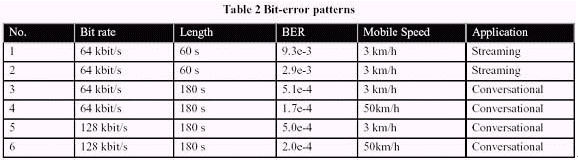 在H.264/AVC的標(biāo)準(zhǔn)化進(jìn)程中,移動(dòng)視頻傳輸?shù)闹匾砸呀?jīng)在3G移動(dòng)傳輸里面通過(guò)對(duì)基于H.324M的電路交換會(huì)話服務(wù)、包交換會(huì)話和流服務(wù)得到了證實(shí)。這些測(cè)試情況允許適當(dāng)?shù)木幋a特征、測(cè)試和容錯(cuò)仿真等特征的選擇,同時(shí)也可以得到有意義的測(cè)試結(jié)果。在本文,我們將會(huì)把重心集中在基于IP的測(cè)試情況。在正常的測(cè)試情況下,我們會(huì)定義6個(gè)測(cè)試情形組合,主要測(cè)試通過(guò)3G移動(dòng)網(wǎng)絡(luò)的包交換會(huì)話服務(wù)和包交換流媒體服務(wù)。另外,測(cè)試環(huán)境包括簡(jiǎn)單的脫機(jī)3GPP/3GPP2仿真軟件、程序接口和評(píng)估標(biāo)準(zhǔn)。無(wú)線信道使用專門生產(chǎn)用于移動(dòng)無(wú)線信道仿真的位率差錯(cuò)模板來(lái)進(jìn)行仿真。 位率差錯(cuò)模板在物理層上和RLC/RLP層下來(lái)捕獲,因此,它們?cè)趯?shí)驗(yàn)被用于物理層仿真。通過(guò)位率差錯(cuò)模板實(shí)驗(yàn)中得出的碼率、長(zhǎng)度、位錯(cuò)誤率和移動(dòng)速度數(shù)據(jù)詳見(jiàn)下表2。