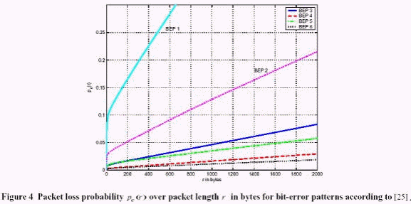數(shù)組3到6的仿真結(jié)果更可靠,在會(huì)話應(yīng)用中需要低錯(cuò)誤率的運(yùn)送者。 假定一任意的字節(jié)的開(kāi)始位置在文件包可能發(fā)生錯(cuò)誤的位置里面。 這些錯(cuò)誤可能性的所有數(shù)據(jù)錯(cuò)誤在圖4中被顯示。 明顯可以看出錯(cuò)誤率會(huì)因?yàn)榘L(zhǎng)度的增加而提高。從位率錯(cuò)誤表格(BEP1和2)可知,當(dāng)包長(zhǎng)度減少的時(shí)候丟包率是不可以接受的, 舉例來(lái)說(shuō),500個(gè)字節(jié), 丟失可能性高達(dá)25%. 高的錯(cuò)誤率需要在鏈路層上重傳。