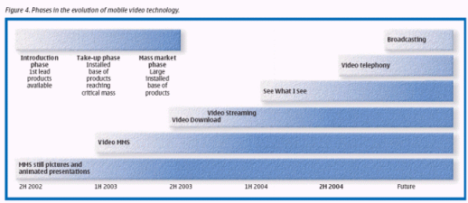 從諾基亞到其它公司,目前有許多具有視頻功能的手機(jī)紛紛出現(xiàn)在市面上。例如,60系列平臺包括了流媒體和視頻播放器功能。獲得60系列平臺許可證的公司有:諾基亞、松下、三星、Sendo和西門子,大致占有全球移動終端市場份額的60%。目前市場上基于60系列的手機(jī)有:西門子的SX-1,三星的SGH-700,諾基亞的7650/3650以及諾基亞的N-Gage。這些手機(jī)立即為發(fā)展商和運(yùn)營商帶來了市場機(jī)遇,同時也為未來的60系列手機(jī)建立起一個統(tǒng)一的、可運(yùn)作的商業(yè)應(yīng)用市場。