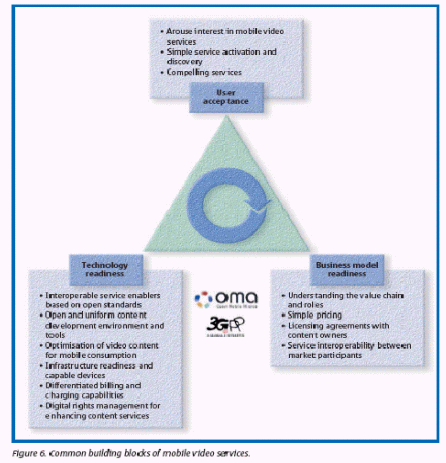 移動視頻服務(wù)會成為其它已制定的多媒體應(yīng)用程序的一個補(bǔ)充。例如,電視并未因網(wǎng)絡(luò)的出現(xiàn)而消逝,同樣的,其它數(shù)字化或傳統(tǒng)的移動傳輸應(yīng)用也不會因?yàn)橐苿右曨l的出現(xiàn)而消失。主要概況中略述了移動視頻的好處。下面的文章則著眼于講述移動視頻服務(wù)的普遍發(fā)展障礙,基于大規(guī)模市場的三個關(guān)鍵標(biāo)準(zhǔn)分別是:技術(shù)預(yù)備程度、商業(yè)模式預(yù)備程度和用戶接受程度。主要的觀點(diǎn)將做更細(xì)致的介紹。