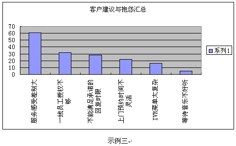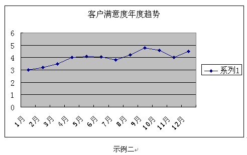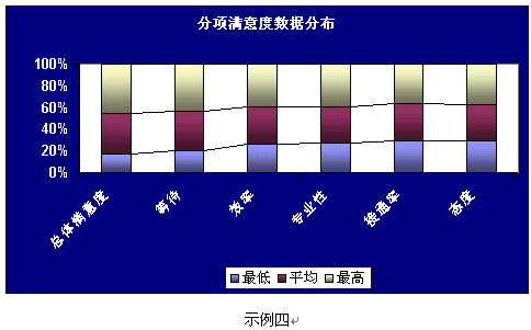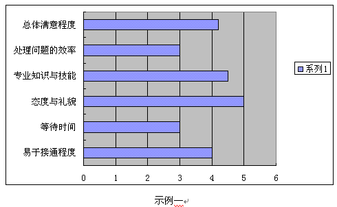 客戶滿意度調(diào)查的數(shù)據(jù)及分析結(jié)果應(yīng)該以一種易讀易解的方式呈現(xiàn)。圖表的形式總是比單純、枯燥的EXCEL表格和長(zhǎng)篇大論更容易被人理解并留下深刻印象。常用的圖表形式示例如下: