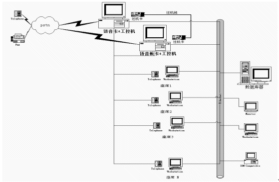 在一些小型CALL CENTER系統(tǒng)中,人們通常通過語音板卡加工控機(jī)的方式搭建系統(tǒng),通常一臺(tái)設(shè)備就集成了ACD、IVR、CTI等各種資源,各資源的使用、調(diào)派通過軟件進(jìn)行控制,有效的解決了建設(shè)成本高、系統(tǒng)構(gòu)造繁復(fù)的問題,具有相當(dāng)?shù)撵`活性。然而由于工控機(jī)和語音板卡容量有限,同時(shí)其標(biāo)準(zhǔn)最多只能是工業(yè)級(jí)標(biāo)準(zhǔn),因此在構(gòu)建相對(duì)大型的呼叫中心時(shí)就總是捉襟見肘。為了增加系統(tǒng)容量,解決多臺(tái)PC之間進(jìn)行通道交換的難題,人們又設(shè)計(jì)了過機(jī)卡和過機(jī)線來解決,其應(yīng)用系統(tǒng)如下圖: