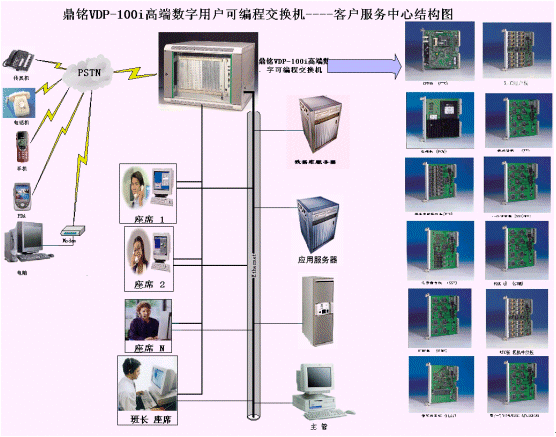 接入平臺實現(xiàn)外界接入的控制和話務(wù)交換、資源的合理分配,是構(gòu)建呼叫中心的成功關(guān)鍵所在。DM大型呼叫中心系統(tǒng)接入平臺采用鼎銘VDP-100i高端數(shù)字可編程交換機,該交換機所有資源板卡都采用了高集成度、功能模塊設(shè)計思想。該接入平臺的結(jié)構(gòu)如上圖所示的右邊(詳細(xì)的功能模塊資源板請參閱《鼎銘高端數(shù)字可編程交換機產(chǎn)品手冊》),用戶可以根據(jù)實際情況靈活配置和增減系統(tǒng)的接入方式、資源類型、資源數(shù)量,達到資源的充分合理利用的目的。