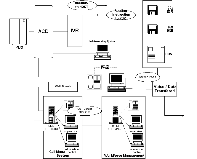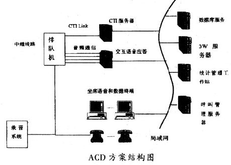 這種方案的核心思想是在專用交換機(jī)+ACD的基礎(chǔ)上擴(kuò)展路由和統(tǒng)計(jì)的功能,開放CTI -Link接口,用CTI技術(shù)實(shí)現(xiàn)通信和計(jì)算機(jī)的功能結(jié)合,再配以必要的語(yǔ)音和數(shù)據(jù)庫(kù)系統(tǒng),從而以強(qiáng)大的通信和計(jì)算機(jī)功能滿足呼叫中心的要求。