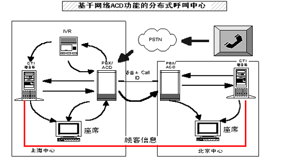 采用智能呼叫分配(ACD),由多種條件決定路由的選擇,如業(yè)務(wù)員的忙閑統(tǒng)計(jì)、業(yè)務(wù)員的服務(wù)能力、每天不同時(shí)段呼叫統(tǒng)計(jì)、主叫用戶的所在區(qū)域以及主叫用戶的號(hào)碼等。企業(yè)呼叫中心甚至可突破語(yǔ)言界限,跨越不同電話系統(tǒng)網(wǎng)絡(luò)分布到全球轉(zhuǎn)發(fā)話音及數(shù)據(jù)。