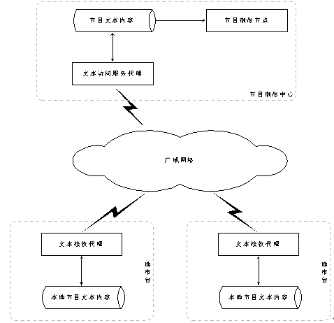 單一的節(jié)目制作中心一般放置在省中心。在節(jié)目制作中心,節(jié)目數(shù)據(jù)以數(shù)據(jù)庫或者文本文件的方式存放于節(jié)目數(shù)據(jù)倉庫中。在節(jié)目制作中心運(yùn)行文本訪問服務(wù)代理,接受各地市臺的數(shù)據(jù)請求并發(fā)送相應(yīng)的數(shù)據(jù)。各個地市臺通過文本請求、接收代理向中心請求或者接收文本數(shù)據(jù),存放于本地?cái)?shù)據(jù)倉庫,等待語音合成服務(wù)器合成成語音文件,地市臺使用合成后的語音文件迅速開通相應(yīng)的節(jié)目。