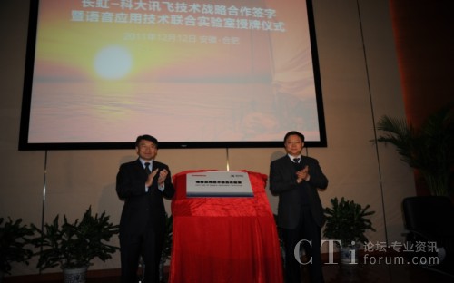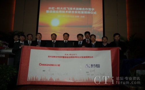 CTI論壇(ctiforum)12月14消息(記者 潘婷婷): 12月12日,科大訊飛與長虹集團(tuán)戰(zhàn)略合作簽約暨共建聯(lián)合實(shí)驗(yàn)室揭牌儀式在科大訊飛語音產(chǎn)業(yè)基地研發(fā)大樓隆重舉行。根據(jù)合作框架協(xié)議,雙方將在戰(zhàn)略聯(lián)盟的基礎(chǔ)上,以共建聯(lián)合實(shí)驗(yàn)室為主要載體,旨在依托各自行業(yè)領(lǐng)域的長期積淀優(yōu)勢(shì)、強(qiáng)強(qiáng)聯(lián)合,達(dá)成戰(zhàn)略互信,加強(qiáng)緊密合作,積極推動(dòng)“語音核心引擎+智能終端平臺(tái)” 的特色應(yīng)用模式,深入拓展智能語音科技在智能電視等終端產(chǎn)品市場的應(yīng)用范圍,合力開創(chuàng)智能語音終端創(chuàng)新應(yīng)用市場空間。