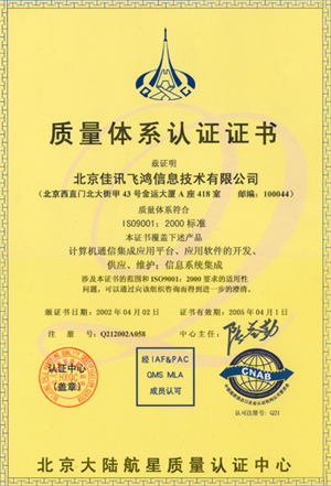 經(jīng)過近半年時(shí)間的建立和保持質(zhì)量體系運(yùn)行,佳訊飛鴻于在2002年3月順利的通過為期三天的嚴(yán)格審核,并重點(diǎn)對(duì)佳訊公司核心技術(shù)的CTI平臺(tái)進(jìn)行審核。2002年4月2日通過了ISO國際組織的新體系標(biāo)準(zhǔn)ISO9001:2000的體系認(rèn)證,取得了通過該標(biāo)準(zhǔn)的認(rèn)證證書。佳訊飛鴻公司也成為國內(nèi)第一家對(duì)CTI平臺(tái)進(jìn)行審核并通過認(rèn)證的公司。其完成標(biāo)志著公司從成立之時(shí)起即嚴(yán)格遵循國際企業(yè)標(biāo)準(zhǔn)及現(xiàn)代企業(yè)管理模式,以軟件產(chǎn)品質(zhì)量管理體系為載體,以客戶需求為導(dǎo)向。全面提高產(chǎn)品、服務(wù)質(zhì)量,順應(yīng)不斷變化的技術(shù)發(fā)展方向和市場(chǎng)變化,在質(zhì)量、技術(shù)、成本和交期等方面全力滿足客戶需求,為客戶提供最佳性價(jià)比的產(chǎn)品和服務(wù)。