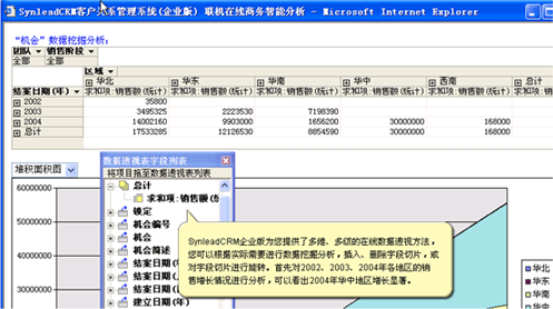 可以利用SynleadCRM企業(yè)版提供的在線聯(lián)機分析工具實現(xiàn),也可以導(dǎo)出到EXCEL中,利用EXCEL的有關(guān)功能實現(xiàn)。OLAP在線聯(lián)機分析,屬于商業(yè)智能BI的組成部分之一,它允許您對數(shù)據(jù)進行任意的上鉆、下鉆,旋轉(zhuǎn)、切片、切塊,得到更豐富的、更有價值的圖表和報表。