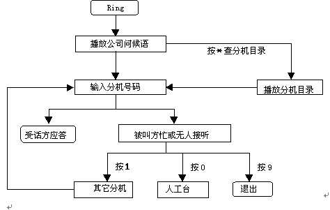 這種情況下自動(dòng)總機(jī)服務(wù)扮演了如同人工總機(jī)的角色,提示來(lái)話方鍵入分機(jī)號(hào)碼并將其轉(zhuǎn)接到指定的分機(jī)去。如果轉(zhuǎn)接不成功(被叫方占線,無(wú)人接聽等)系統(tǒng)提示主叫轉(zhuǎn)到其它分機(jī)或轉(zhuǎn)人工臺(tái)。