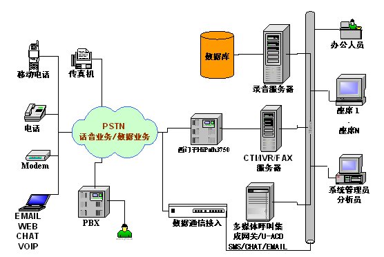 本方案采用西門子HiPath3750交換機,通過強訊中間件控制整個呼叫中心的電話呼入、呼出。它支持多種聯(lián)絡渠道,包括語音、交互式自動語音應答(IVR)、傳真、短消息。