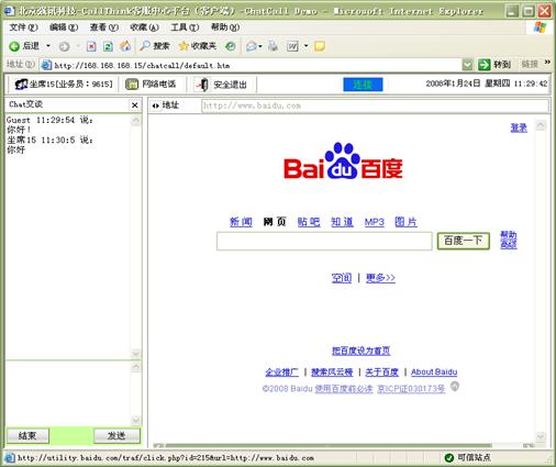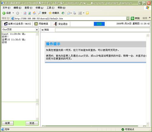 Chart交談:客戶可以選擇通過WEB頁面與座席通過文字的形式進(jìn)行交談,無需語音通信 ,客戶進(jìn)入特定的CHAT網(wǎng)頁后,可以選擇一個座席或一組座席進(jìn)行CHAT交談。如圖12和13所示:
