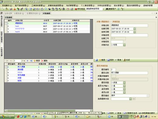 外呼中還可以建立問卷調(diào)查任務(wù)。同時還提供題庫管理、問卷編輯等功能,并且題目之間還可以設(shè)計(jì)流轉(zhuǎn)順序。方便使用者靈活設(shè)定問卷內(nèi)容。如圖20、21所示:
