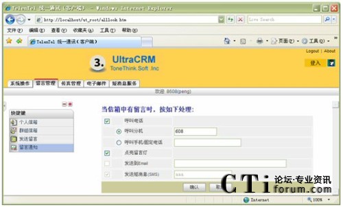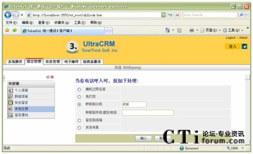信箱主人通過Web方式的客戶端,根據(jù)實際需要,將來話設置為轉接到不同的目標,如:語音信箱留言、內部其它分機、轉移至手機、轉移至外線;