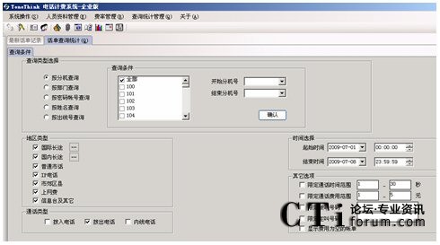 系統(tǒng)提供多種查詢條件,進行話單明細和話單結算的統(tǒng)計,如:按分機、部門、密碼、職員名稱、出現(xiàn)號碼、通話時間范圍、通話費用范圍、制定主叫、制定被叫、不同的通話類型(國內長途、國際長途、市話、IP等)。
