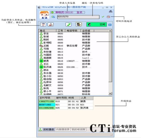 辦公人員可以通過時(shí)實(shí)電話的界面:實(shí)時(shí)監(jiān)控系統(tǒng)的呼叫隊(duì)列、其它辦公人員的工作狀態(tài);并且通過屏幕控制電話的接答、掛機(jī)、轉(zhuǎn)接,以及建立會議等操作。如下圖所示: