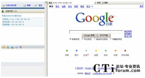 在客服人員與網(wǎng)站訪客聊天的過程中,可以通過“網(wǎng)頁同步”,使網(wǎng)站訪客的電腦上自動(dòng)彈出與客服人員同樣的網(wǎng)頁(如下圖:網(wǎng)站訪客的電腦上自動(dòng)彈出www.google.com的網(wǎng)站)。