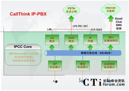 IPCC Core是IP-PBX的核心部分,提供了配置IP分機(jī)號碼(Extension Number)、功能按鈕以及通話管理和ACD路由策略功能;它可以支持多達(dá)1000個(gè)IP語音終端呼叫請求,通過分組交換,實(shí)現(xiàn)IP分機(jī)、普通分機(jī)、互聯(lián)網(wǎng)上IP電話之間的互聯(lián)互通;通過Voip網(wǎng)關(guān),可以實(shí)現(xiàn)IP網(wǎng)絡(luò)和傳統(tǒng)電路交換電話網(wǎng)的通信,完成異種網(wǎng)絡(luò)的電話呼入和呼出;
