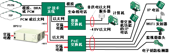 上圖顯示了如何將 BPS12 部署到典型的網(wǎng)絡(luò)中。該公司擁有一個(gè) IP 電話系統(tǒng),并使用 BPS12 來(lái)確保當(dāng)交流電源中斷時(shí)電話服務(wù)繼續(xù)工作。此方案中沒(méi)有使用