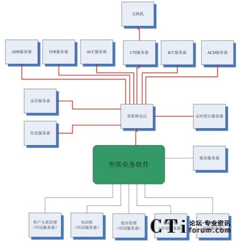 很多集成商或業(yè)務(wù)軟件開發(fā)商認(rèn)為這種結(jié)構(gòu)過于復(fù)雜,而他們自身往往提供“整體解決方案”,即所有的服務(wù)器軟件基本上都是自己的,根據(jù)客戶的要求修改即可。例如,客戶關(guān)系管理、知識(shí)庫(kù)、投訴管理、OA、訂單管理以及坐席軟電話、ADS服務(wù)器、IVR服務(wù)器、ACC服務(wù)器、ICC服務(wù)器、ACD服務(wù)器、錄音服務(wù)器、傳真服務(wù)器、報(bào)表服務(wù)器、實(shí)時(shí)統(tǒng)計(jì)服務(wù)器都是自己來做,那么對(duì)于很多接口環(huán)節(jié)都可以節(jié)省了。