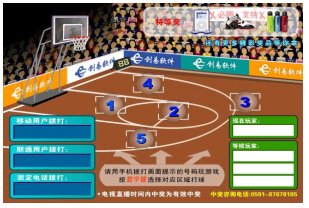 場(chǎng)地分成 5 個(gè)區(qū)域,分別對(duì)應(yīng) 1 - 5 ,想在哪個(gè)區(qū)域投籃就按電話(huà)機(jī)上對(duì)應(yīng)的 1-5 號(hào)鍵或直接在手機(jī)上寫(xiě)短信區(qū)域號(hào)( 1-5 )發(fā)送到短信號(hào)碼,即可完成一次進(jìn)攻,投中后即可可獲得獎(jiǎng)品。本游戲由電視臺(tái)、網(wǎng)站與電信運(yùn)營(yíng)商聯(lián)合經(jīng)營(yíng)的電信增值業(yè)務(wù),由電視臺(tái)提供頻道向電視觀(guān)眾播出游戲畫(huà)面(含圖像和聲音),電信運(yùn)營(yíng)商提供電話(huà)線(xiàn)路和短信通道,參與者通過(guò)固定電話(huà)、小靈通和手機(jī)參與游戲,運(yùn)營(yíng)方通過(guò)收取固定電話(huà)、小靈通和手機(jī)的信息費(fèi)實(shí)現(xiàn)盈利。