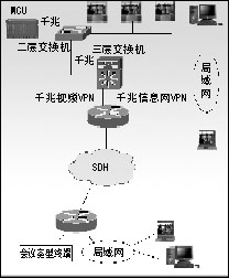 綜合業(yè)務(wù)數(shù)據(jù)網(wǎng)上的信息網(wǎng)VPN,連接省公司和各市公司的局域網(wǎng),桌面終端分布于省市兩級的局域網(wǎng)上。MCU通過三層交換方式接入省公司的信息網(wǎng),實現(xiàn)各個桌面會議終端的接入。在信息網(wǎng)上,要設(shè)置路由的QoS,實現(xiàn)桌面視音頻業(yè)務(wù)的優(yōu)先傳送。