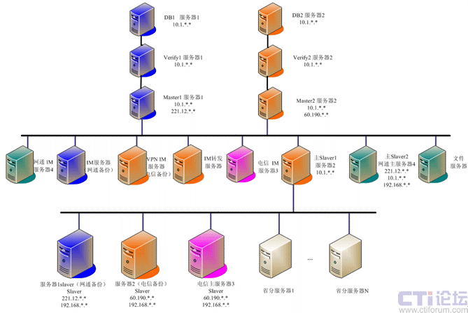 系統(tǒng)基礎(chǔ)平臺(tái)的部署采用4臺(tái)物理服務(wù)器方式實(shí)現(xiàn),四臺(tái)物理服務(wù)器分別有多塊網(wǎng)卡,為不同網(wǎng)絡(luò)用戶提供不同服務(wù),同時(shí)實(shí)現(xiàn)實(shí)現(xiàn)核心數(shù)據(jù)的冗余、備份。在二級(jí)機(jī)構(gòu),即在省級(jí)每個(gè)省部署一臺(tái)分服務(wù)器,實(shí)現(xiàn)當(dāng)?shù)赜脩舻臄?shù)據(jù)轉(zhuǎn)發(fā)等任務(wù),系統(tǒng)部署入下圖所示: