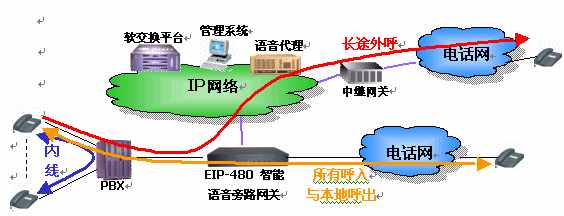 EIP-480設(shè)備處于企業(yè)PBX(電話交換機(jī))和PSTN(固定電話網(wǎng))之間。它具有呼叫智能選路功能,支持通過判斷被叫號碼,自動(dòng)將異地企業(yè)間或外部長途電話旁路到IP網(wǎng)絡(luò)上。