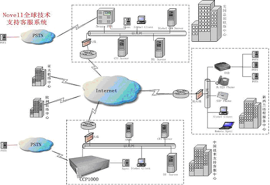 Novell中國(guó)技術(shù)支持中心采用融天科技的RT-CCP1000作為呼叫處理平臺(tái),業(yè)務(wù)處理通過(guò)Internet用瀏覽器的方式使用美國(guó)現(xiàn)有的Siebel CRM業(yè)務(wù)系統(tǒng),作為Novell全球客戶服務(wù)支撐體系的一個(gè)分支,響應(yīng)來(lái)自全球的客戶服務(wù);贗P網(wǎng)絡(luò),系統(tǒng)設(shè)立了遠(yuǎn)端座席,為不同地區(qū)的用戶提供本地化、無(wú)差異化的服務(wù)。