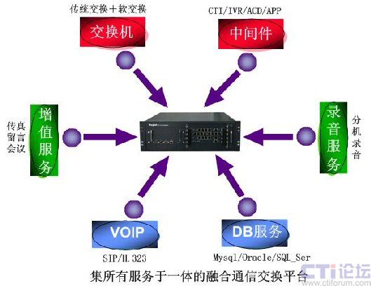 融天科技多媒體呼叫中心采用國際領(lǐng)先技術(shù)的融合通信一體化平臺(tái),該平臺(tái)集傳統(tǒng)PBX、IP-PBX于一體,集CTI、IVR、ACD、APP等服務(wù)功能于一體,集錄音、傳真、會(huì)議、留言等全套的增值業(yè)務(wù)于一體,硬件平臺(tái)非常簡單,用戶只需要購買一臺(tái)硬件設(shè)備即可: