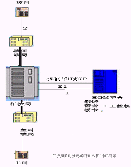 2.1 無迂回話路模式要求交換機能同時發(fā)起兩個呼叫,一般來說,移動、聯(lián)通、小靈通等運營商的交換機可實現(xiàn)這種技術(shù)功能。當呼叫進入?yún)R接局交換機后,獲取呼叫的主被叫信息后,由匯接局交換機同時發(fā)起兩個呼叫,一個去端局的真正被叫,另一個去BGM平臺(相當于由交換機來完成對BGM特服號的呼出)。當被叫方摘機,匯接局首先控制主叫與被叫接通,然后通過七號的ISUP信令通知BGM平臺據(jù)被叫用戶保存的定制的彩話信息和業(yè)務(wù)邏輯對主被叫的通話進行相應(yīng)的背景語音播放操作,該語音僅作為背景音樂,不影響正常的雙方通話,類似于作一個四方會議的操作。當主被叫任意方掛機時,交換機將IVR單元和被叫的連接斷開,這樣就完成了一個完整的彩話服務(wù)。這種模式下比較容易實現(xiàn),并且所需BGM平臺語音板卡較少。如下結(jié)構(gòu)示意圖: